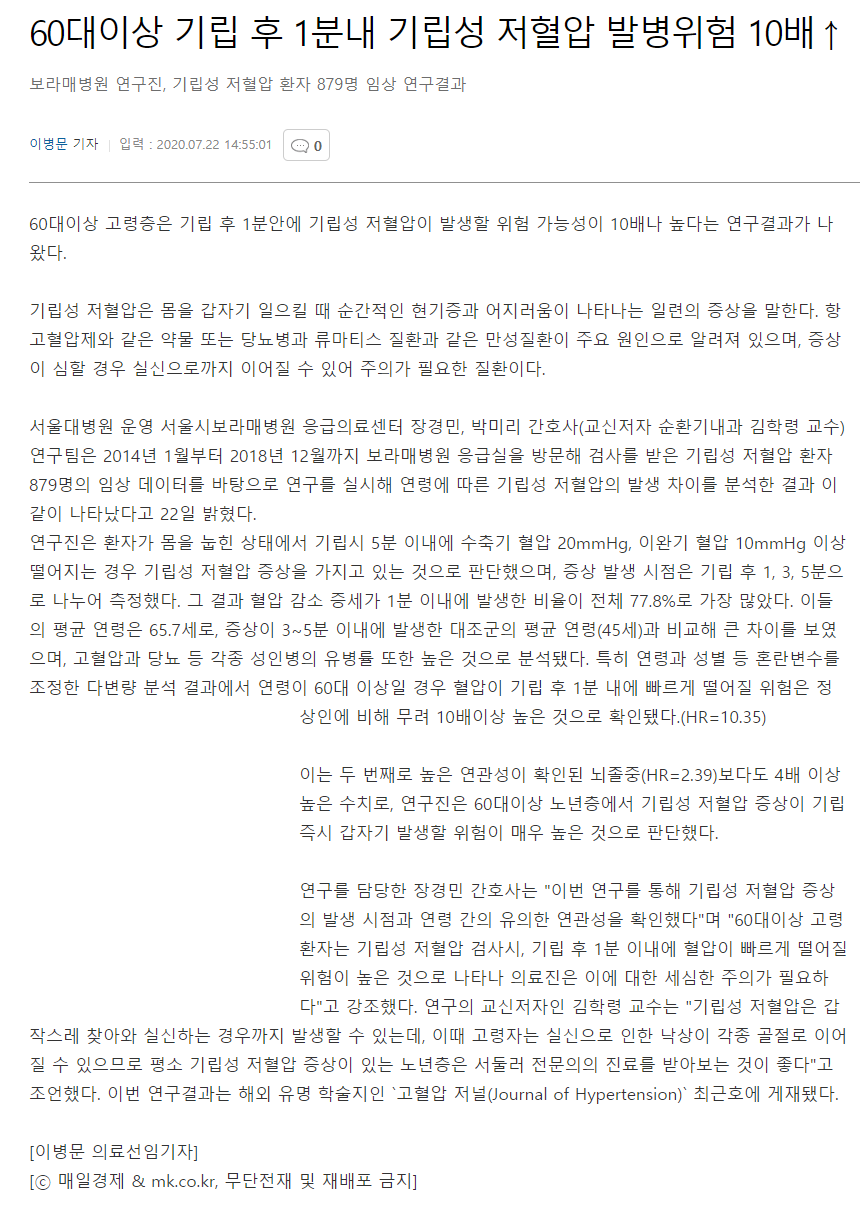 ¿¬±¸¸¦ ´ã´çÇÑ Àå°æ¹Î °£È£»ç´Â "À̹ø ¿¬±¸¸¦ ÅëÇØ ±â¸³¼º ÀúÇ÷¾Ð Áõ»óÀÇ ¹ß»ý ½ÃÁ¡°ú ¿¬·É °£ÀÇ À¯ÀÇÇÑ ¿¬°ü¼ºÀ» È®ÀÎÇß´Ù"¸ç "60´ëÀÌ»ó °í·É ȯÀÚ´Â ±â¸³¼º ÀúÇ÷¾Ð °Ë»ç½Ã, ±â¸³ ÈÄ 1ºÐ À̳»¿¡ Ç÷¾ÐÀÌ ºü¸£°Ô ¶³¾îÁú À§ÇèÀÌ ³ôÀº °ÍÀ¸·Î ³ªÅ¸³ª ÀÇ·áÁøÀº ÀÌ¿¡ ´ëÇÑ ¼¼½ÉÇÑ ÁÖÀǰ¡ ÇÊ¿äÇÏ´Ù"°í °Á¶Çß´Ù. ¿¬±¸ÀÇ ±³½ÅÀúÀÚÀÎ ±èÇÐ·É ±³¼ö´Â "±â¸³¼º ÀúÇ÷¾ÐÀº °©ÀÛ½º·¹ ã¾Æ¿Í ½Ç½ÅÇÏ´Â °æ¿ì±îÁö ¹ß»ýÇÒ ¼ö Àִµ¥, À̶§ °í·ÉÀÚ´Â ½Ç½ÅÀ¸·Î ÀÎÇÑ ³«»óÀÌ °¢Á¾ °ñÀý·Î À̾îÁú ¼ö ÀÖÀ¸¹Ç·Î Æò¼Ò ±â¸³¼º ÀúÇ÷¾Ð Áõ»óÀÌ ÀÖ´Â ³ë³âÃþÀº ¼µÑ·¯ Àü¹®ÀÇÀÇ Áø·á¸¦ ¹Þ¾Æº¸´Â °ÍÀÌ ÁÁ´Ù"°í Á¶¾ðÇß´Ù. À̹ø ¿¬±¸°á°ú´Â ÇØ¿Ü À¯¸í ÇмúÁöÀÎ `°íÇ÷¾Ð Àú³Î(Journal of Hypertension)` ÃÖ±ÙÈ£¿¡ °ÔÀçµÆ´Ù.